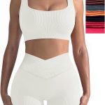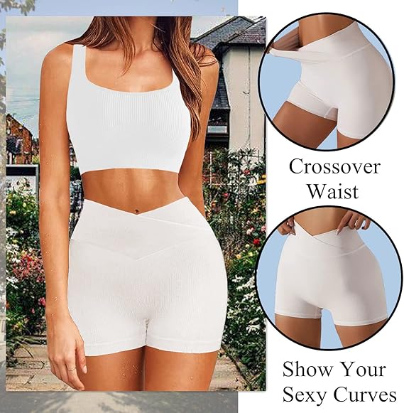 - [Crossover waist]: The womens workout sets shorts is crossover waist. And the V-waist design will show off your sexy belly button nail. It cut to a high waist and made your waist look super smooth. Our seamless knit fabric is supportive structure. It gives you confidence in any situation.